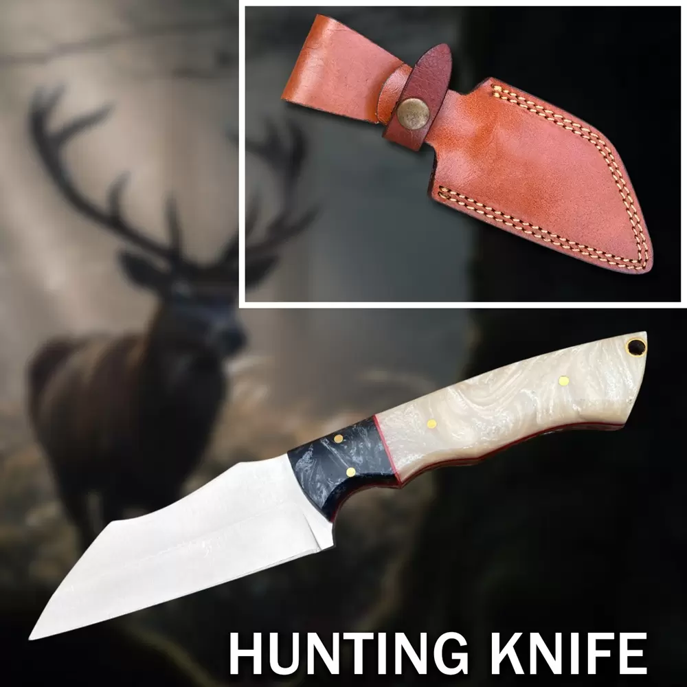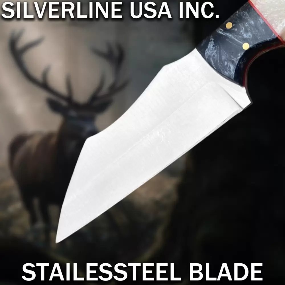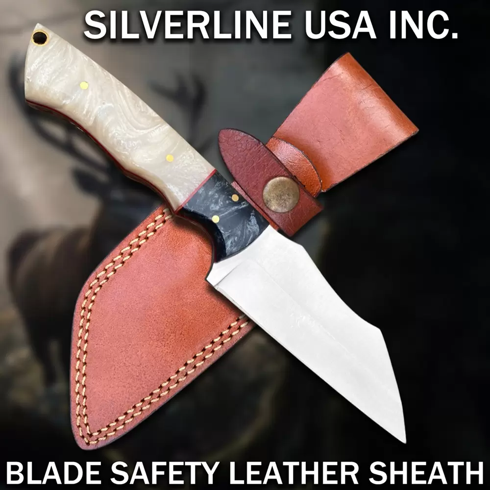Stainless Steel Skinner KnifeOverall Length 9"Blade Length 4.5"Handle Length 4.5"Blade Material:Stainless Steel BladeHandle Material:Black & White Pearl Resin handle.Leather Sheath: Available With Genuine Leather Sheath.