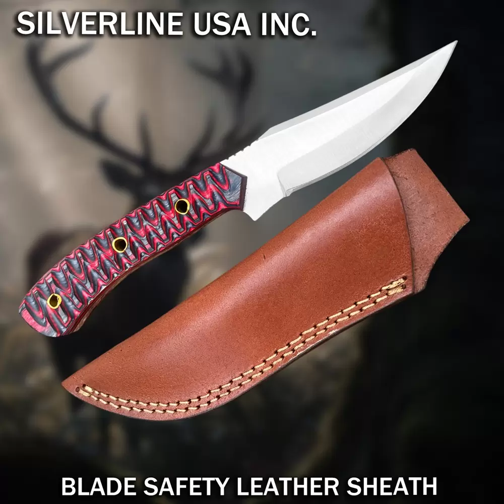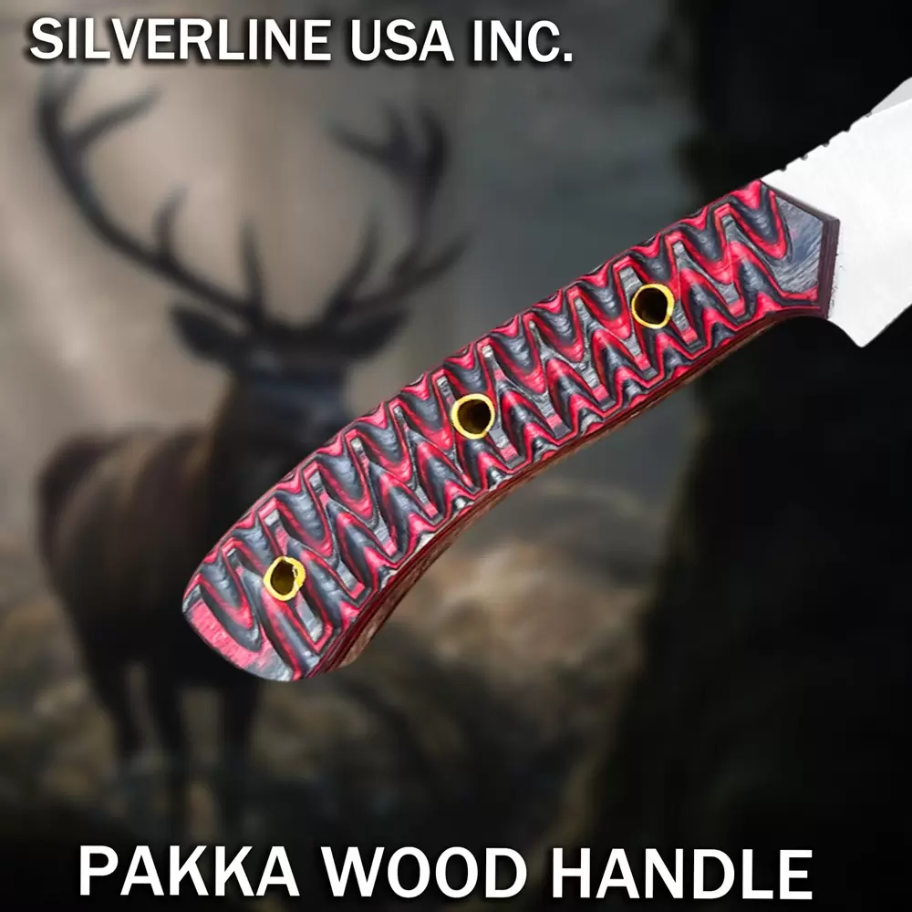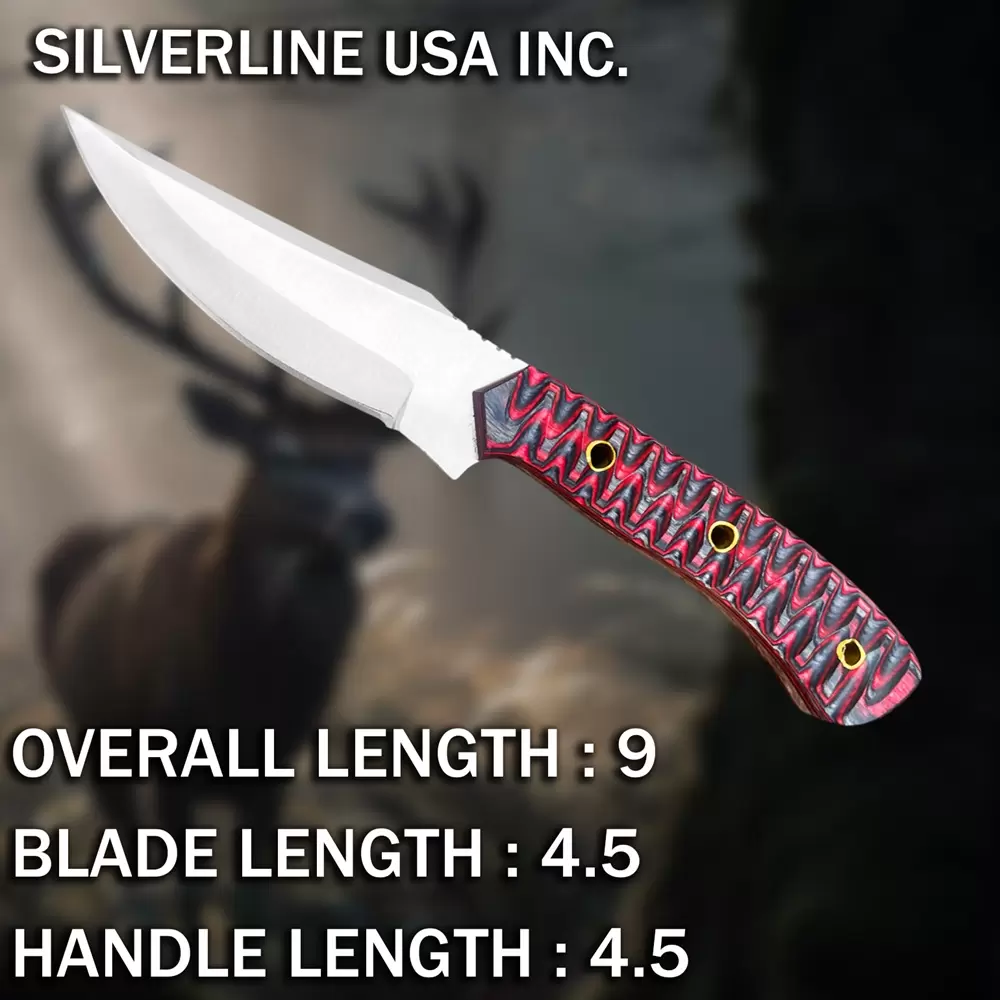 Stainless Steel Skinner KnifeOverall Length 9"Blade Length 4.5"Handle Length 4.5"Blade Material:Stainless Steel BladeHandle Material:Pakka Wood Red & Black handle.Leather Sheath: Available With Genuine Leather Sheath.