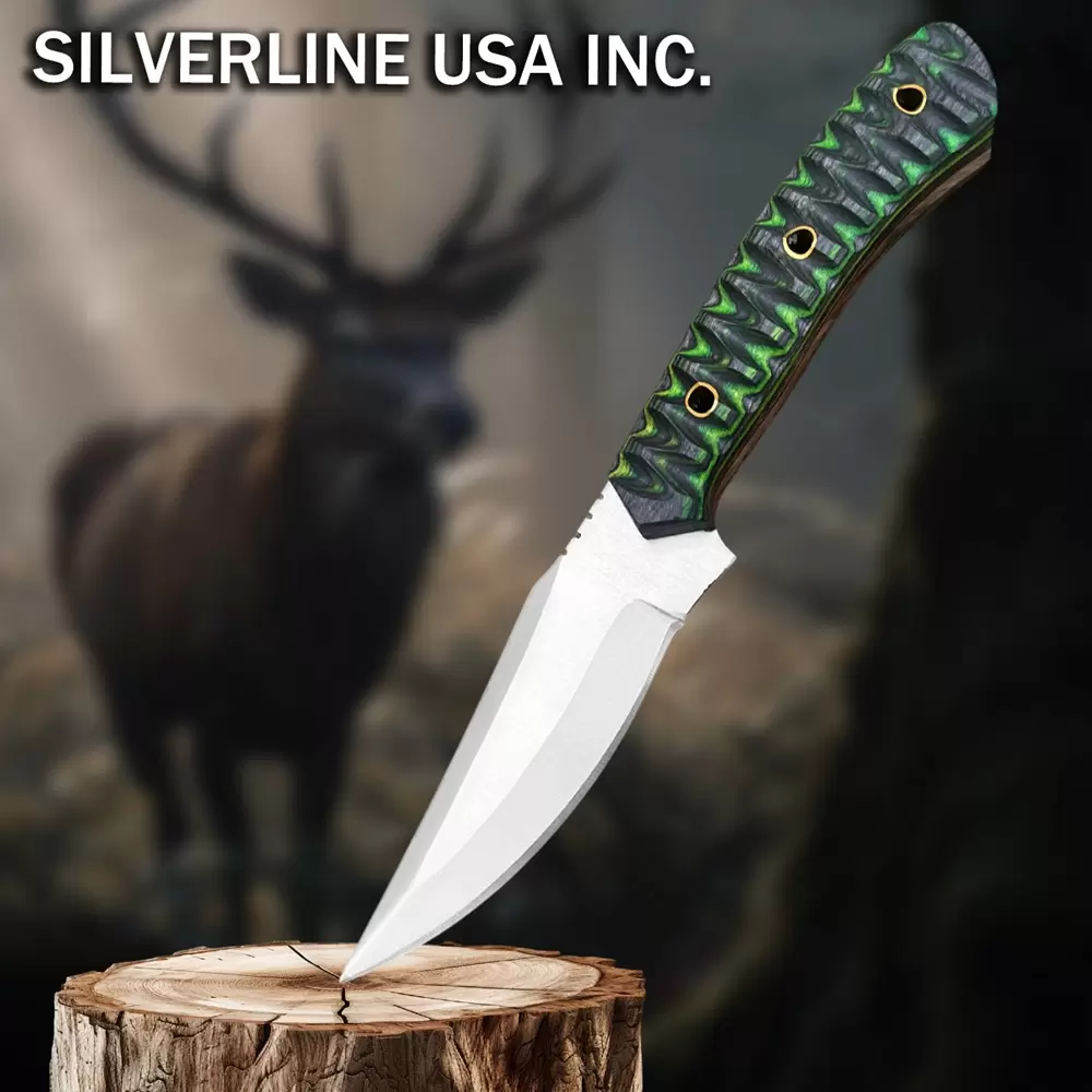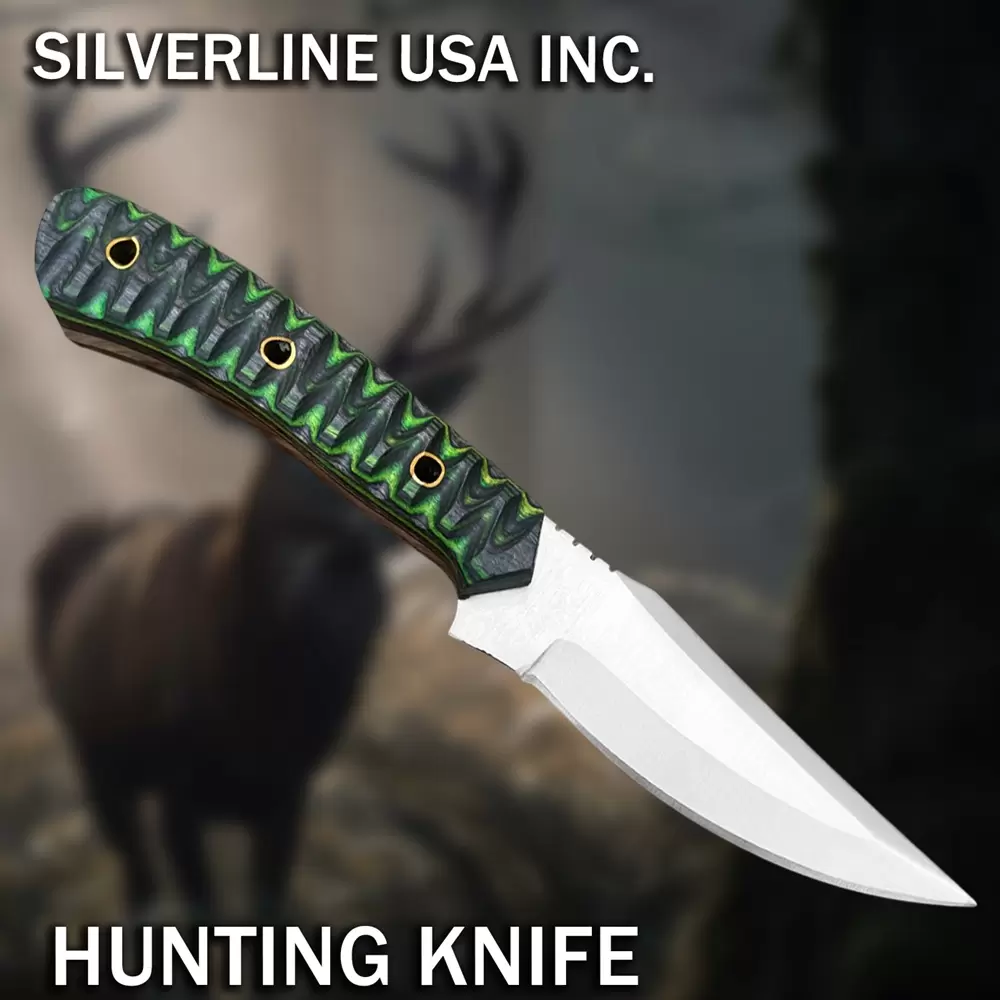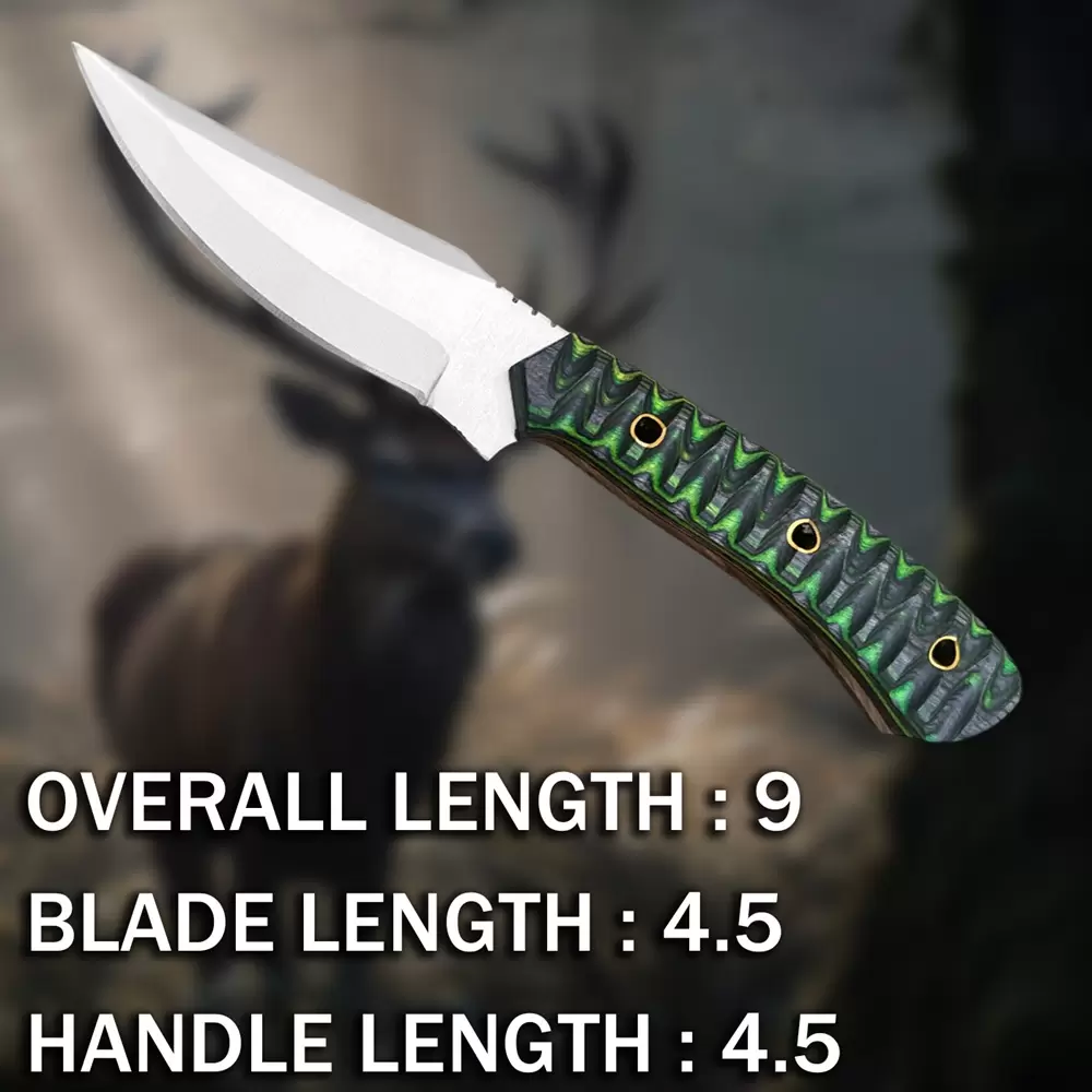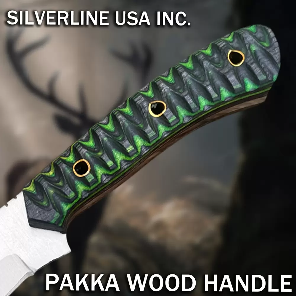 Stainless Steel Skinner KnifeOverall Length 9"Blade Length 4.5"Handle Length 4.5"Blade Material:Stainless Steel BladeHandle Material:Pakka Wood Green & Black handle.Leather Sheath: Available With Genuine Leather Sheath.