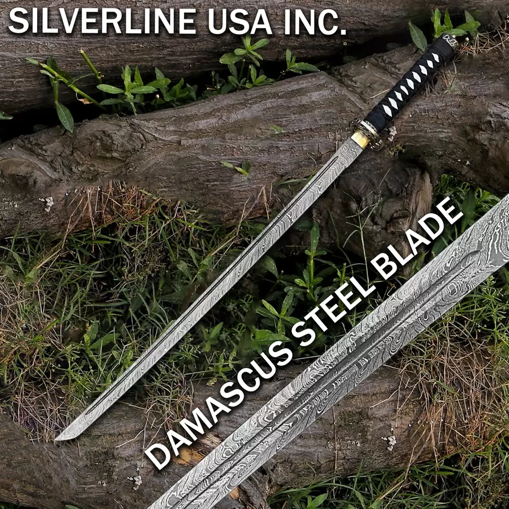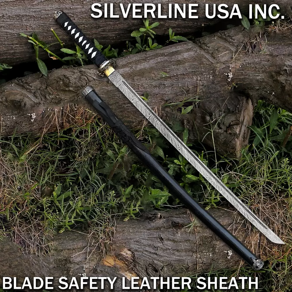 Damascus Handmade Sword With Leather Sheath- Full TangOverall Length 40 InchesBlade Length 30 InchesHandel Length 10 InchesReal Damascus Steel Blade forged with Carbon steel 1095 and 15n20With Leather Scabbard