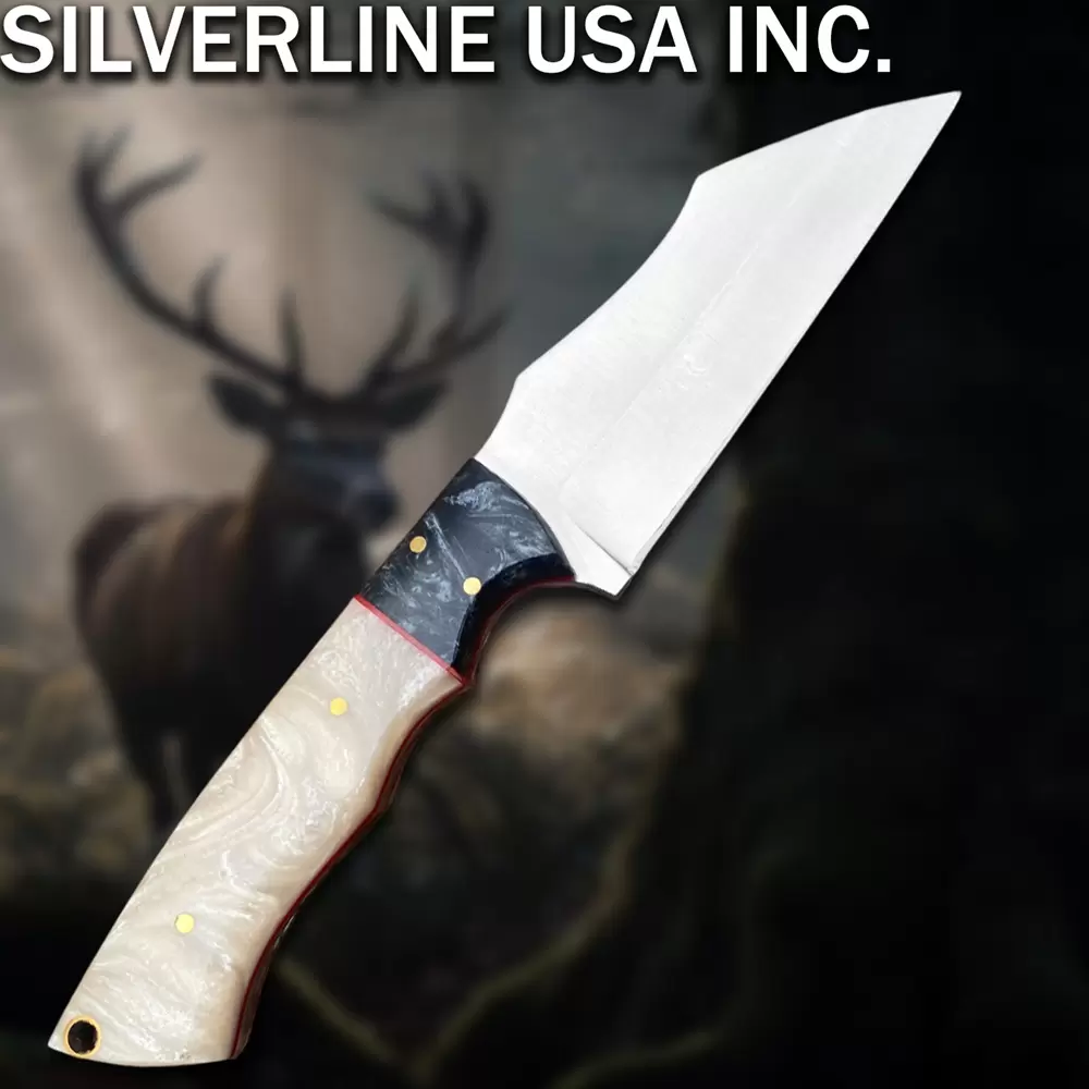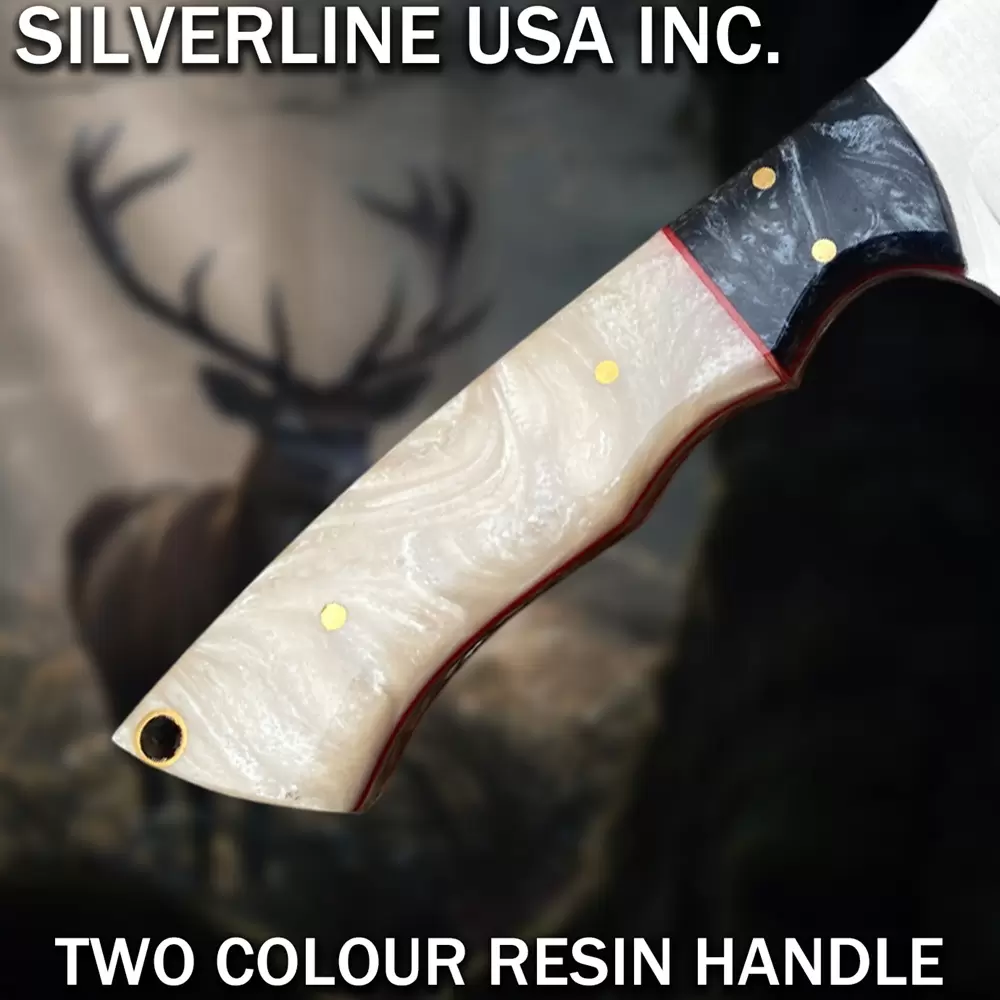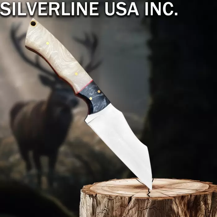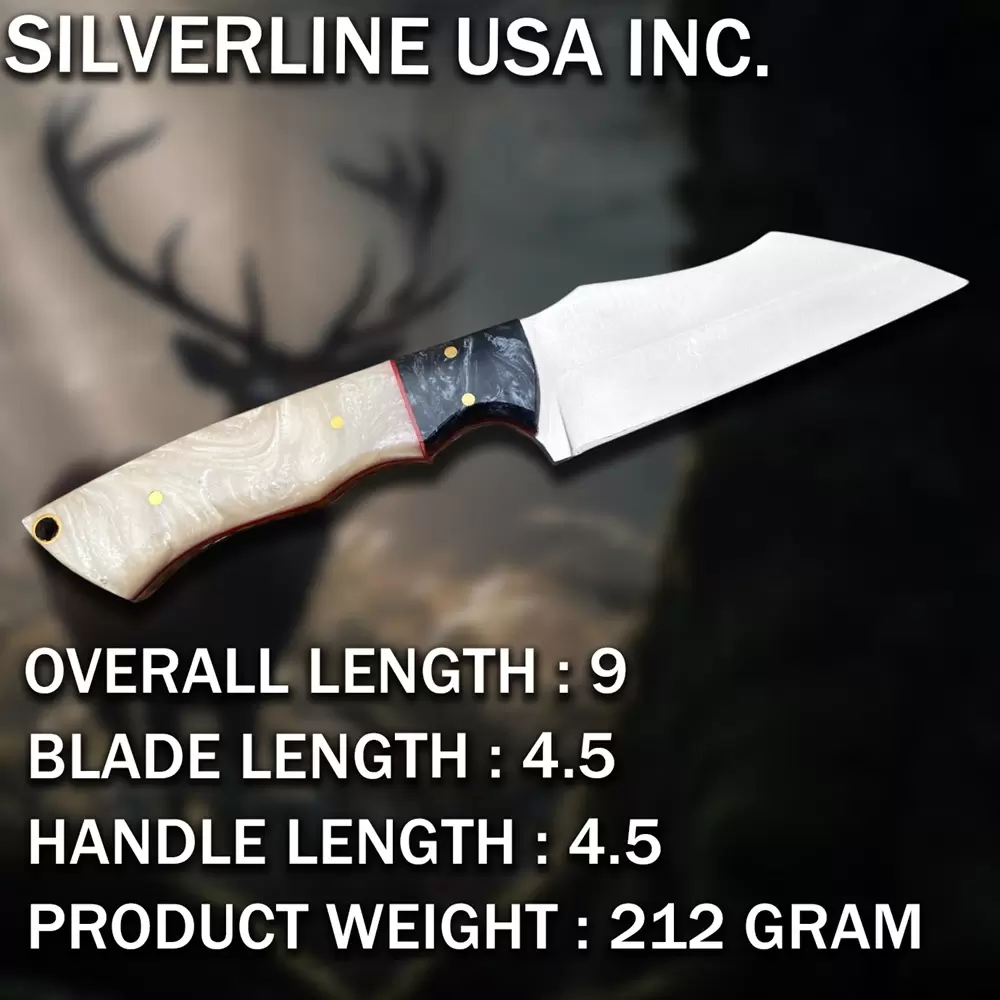 Stainless Steel Skinner KnifeOverall Length 9"Blade Length 4.5"Handle Length 4.5"Blade Material:Stainless Steel BladeHandle Material:Black & White Pearl Resin handle.Leather Sheath: Available With Genuine Leather Sheath.