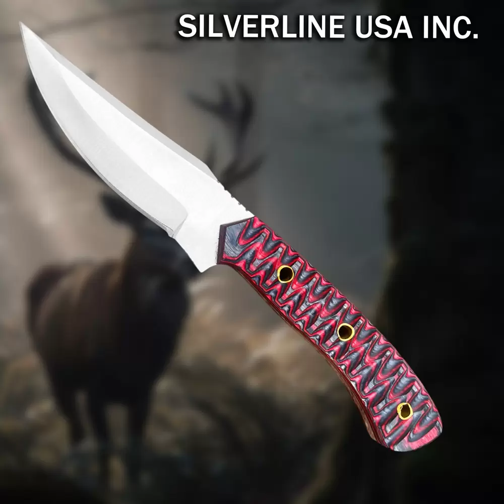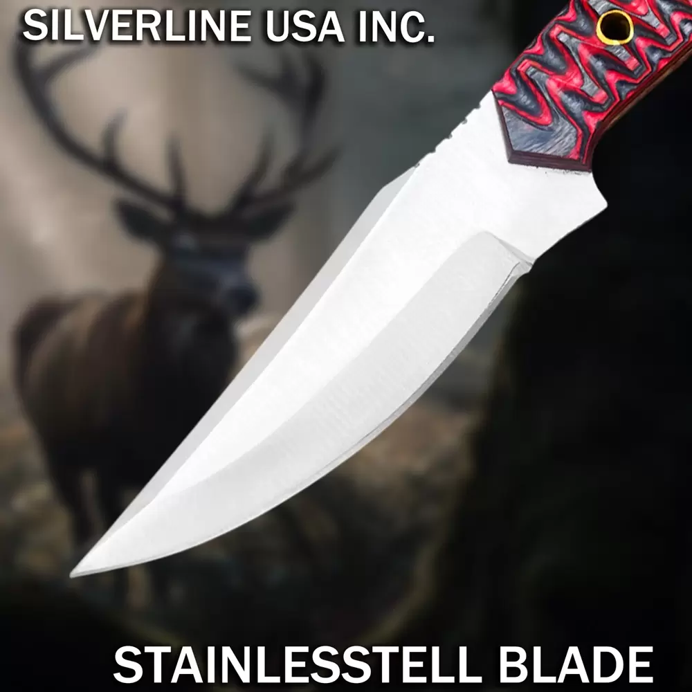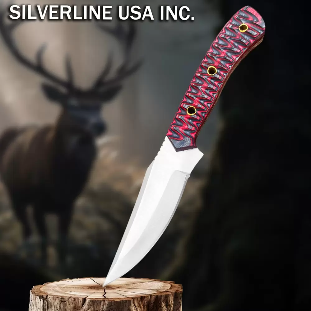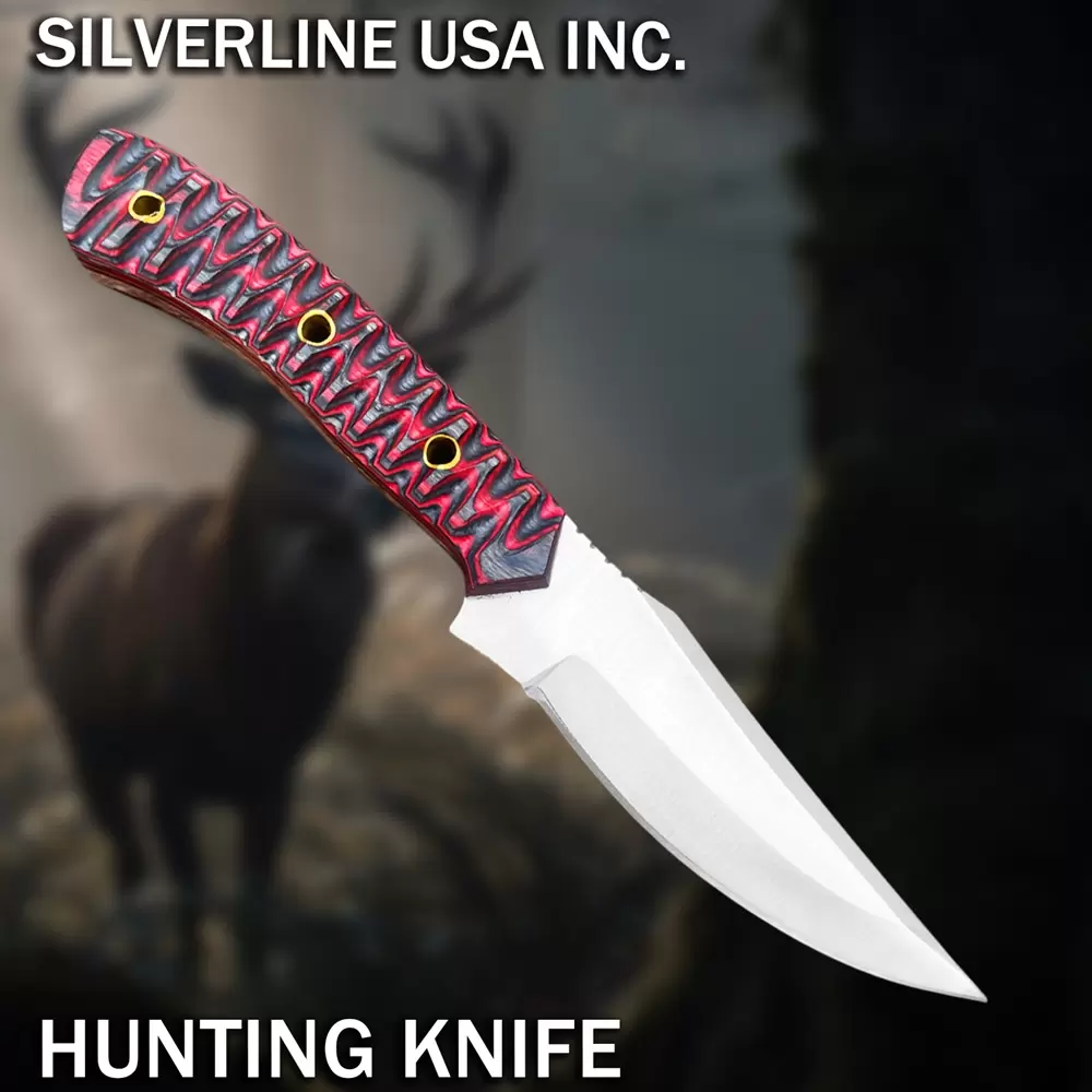 Stainless Steel Skinner KnifeOverall Length 9"Blade Length 4.5"Handle Length 4.5"Blade Material:Stainless Steel BladeHandle Material:Pakka Wood Red & Black handle.Leather Sheath: Available With Genuine Leather Sheath.